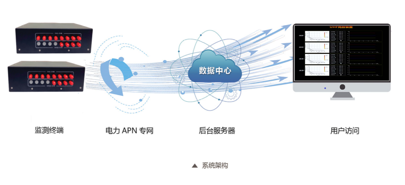 通过在开关柜安装内置式特高频传感器获取脉冲电流信号,将信号传输到采集单元进行分析处理,通过485通讯将数据传输到后台服务器系统,系统对开关柜局部放电进行检测和诊断。