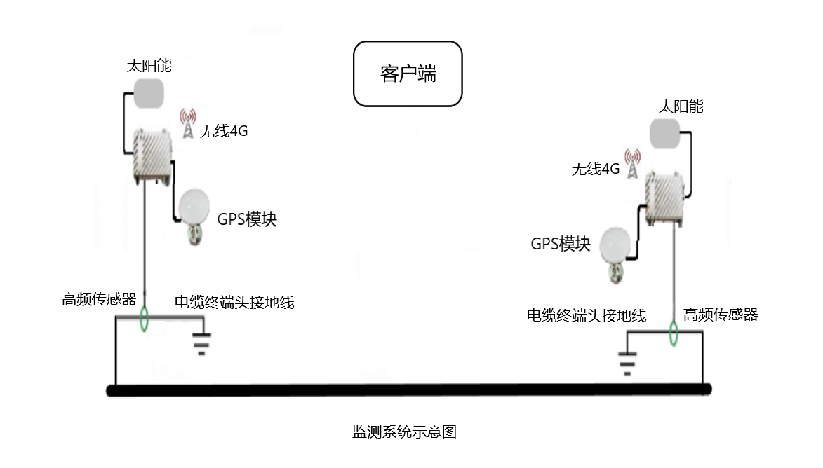 配网电缆状态预警及故障定位在线监测系统由2只高频传感器、2台GPS授时模块、2台采集单元、2台太阳能装置、2台无线通讯模块和后台服务器系统组成。