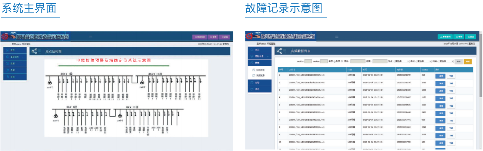 当地功能: 系统后台安装于主站内,配置一次系统图,实现故障预警、选线、测距的系统图故障线路闪烁、弹窗报警、声音报警。